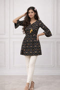 Tunic Top with Waist Elastic & Back Tie Detail Women’s Black Floral Rayon Cotton