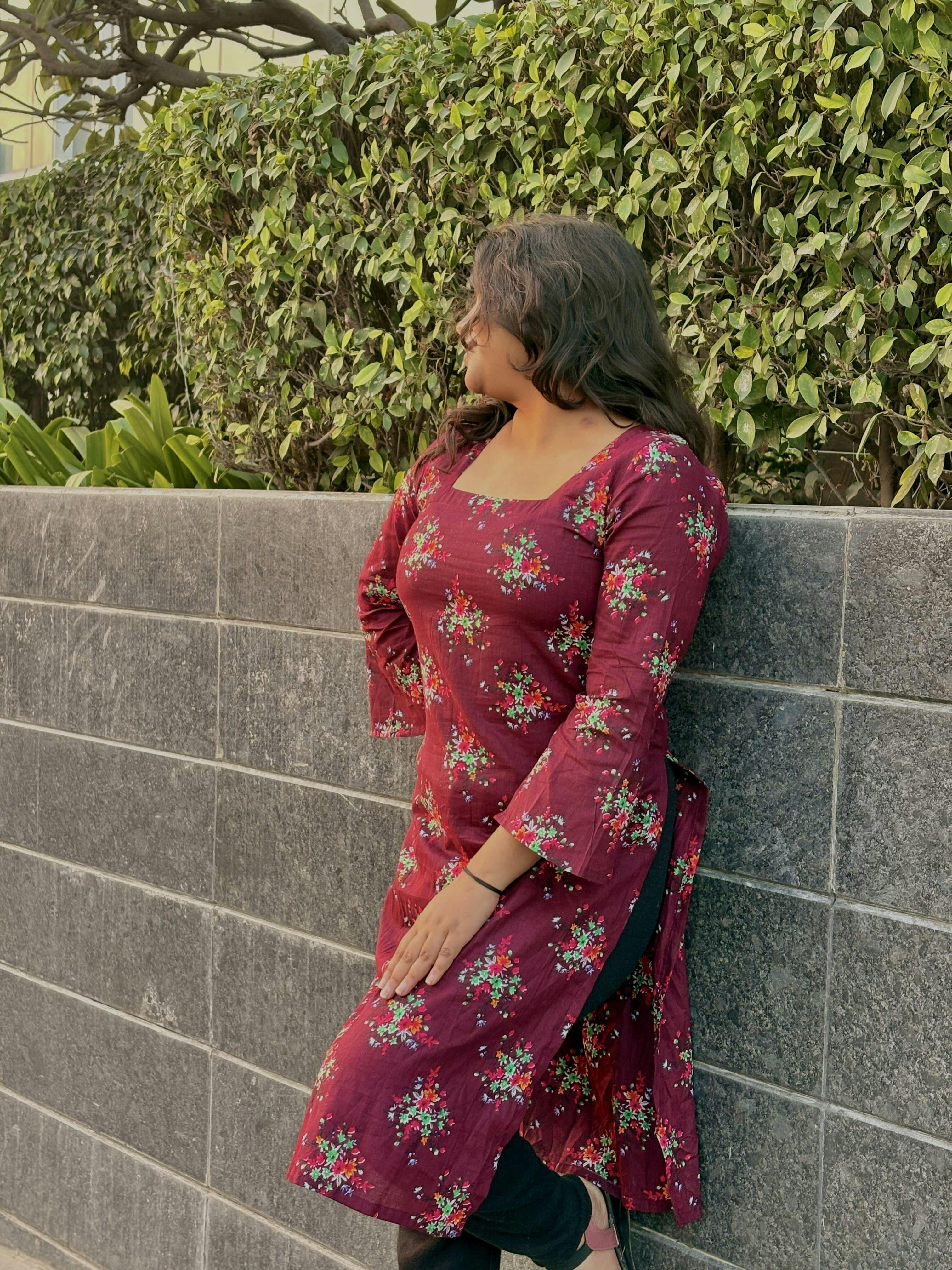 Floral Print Long Kurti β Square Neck & Elegant Bell Sleeves-Cotton